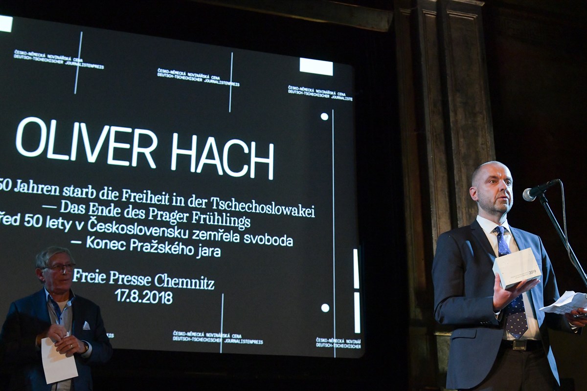In der Kategorie Text wurde Oliver Hach für sein Dossier ausgezeichnet „Vor 50 Jahren starb die Freiheit in der Tschechoslowakei – Das Ende des Prager Frühlings“, Freie Presse Chemnitz, 17.8.2018. Die Jury ehrt seinen umfassenden Rückblick auf die Ereignisse des „Prager Frühlings“ aus der Perspektive der ehemali-gen DDR. Eindrucksvoll zeige er, dass die Niederschlagung der tschechoslowakischen Reformbewegung keine fremde, sondern Teil der eigenen ostdeutschen Geschichte ist. Die Spuren, die sie hinterlassen hat, sind der rote Faden, der sich durch die acht-seitige Beilage zieht. „Oliver Hach zeigt eine profunde Kenntnis des tschechischen Nachbarn und versteht sich aufs Schreiben. Jeder einzelne Beitrag wie auch das Gesamtprodukt dieser Beilage sind überzeugend“, unterstrich Jurymitglied Daniel Brössler, Süddeutsche Zeitung.